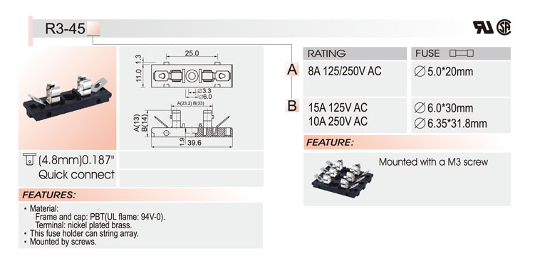 5*20/6*30 PCB安裝保險(xiǎn)絲座 R3-45 UL CSA 15A250V